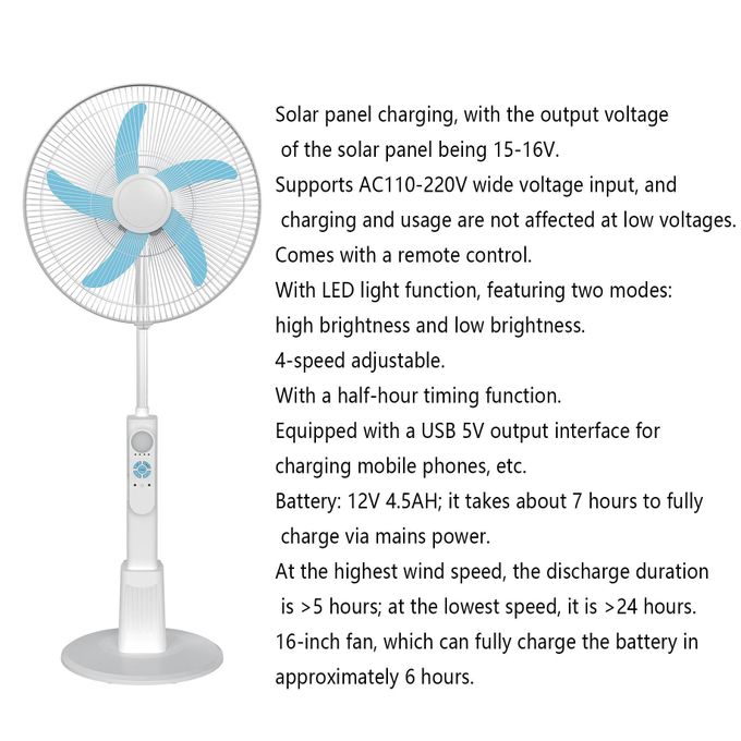 Standing Pedestal Fan 16 Inches Rechargeable Fan +Solar Panel + LED Light